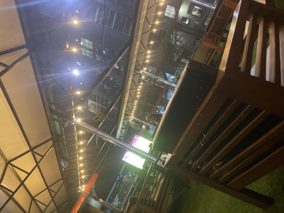 An outdoor restaurant at night features a partially covered seating area. String lights adorn the ceiling, and a large television screen is visible in the center. Buildings surround the open space, creating an urban ambiance. Wooden benches offer seating, situated on artificial grass. The image is taken at an oblique angle, lending a unique perspective to the scene.