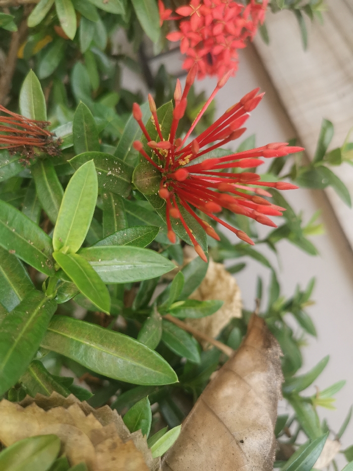The scene depicts a close-up view of a flowering plant located in Otolokpo, Nigeria. A prominent cluster of approximately two dozen bright red flower buds and partially opened flowers occupies the central right, displaying elongated, pointed forms and yellow stamens at their apertures. In the upper background, a blurred mass of smaller, fully bloomed red flowers is visible. The plant exhibits dense, dark green, ovate-lanceolate foliage, with some leaves showing fine particulate residue. To the immediate left of the central flowers, a cluster of withered, dark brown flower remnants is present. Several dry, light brown leaves are interspersed among the green leaves in the lower foreground. The background is an out-of-focus, light-toned vertical surface.
