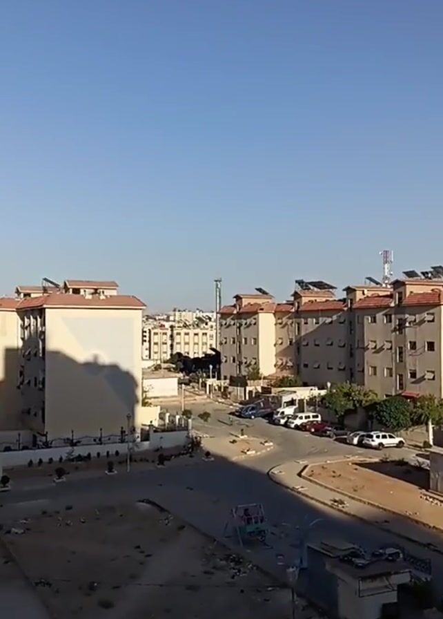 residential area with several multi-story buildings. The buildings appear to be made of light-colored material and have reddish-brown roofs. Some of the roofs are equipped with solar panels. The streets are paved, and there are a few cars parked along the sides. In the foreground, there is an open area with some sparse vegetation and what appears to be a small playground. The sky is clear and blue. There are no visible people.