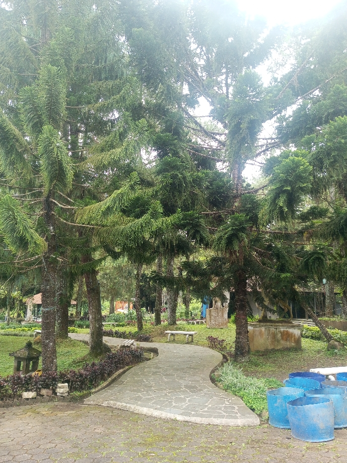 The image displays an outdoor park or garden scene in Nuwara Eliya, Sri Lanka. The foreground features a winding pathway constructed from light-grey flagstones, originating from a darker, possibly hexagonal-paved area on the left. Immediately to the right of the pathway's commencement, a cluster of four to five open-top blue plastic barrels or drums are positioned on the ground. Several tall, coniferous trees with dense, pendulous green foliage populate the landscape, creating a partial canopy overhead and casting diffuse light. Along the left side of the flagstone path, near the base of a tree, a dark grey stone lantern-like structure is visible. Further into the scene, a light-colored stone bench is situated on the grassy verge to the left of the path, with a corresponding bench visible on the right side. In the middle ground, through the trees on the left, a gazebo-like structure with a reddish roof can be partially discerned. On the right side, behind the stone bench, a weathered, rectangular stone planter or plinth stands. Beyond this, a tall, light-colored statue or column is partially visible amongst the foliage. No people are present, and no actions or interactions are depicted within this static outdoor environment.