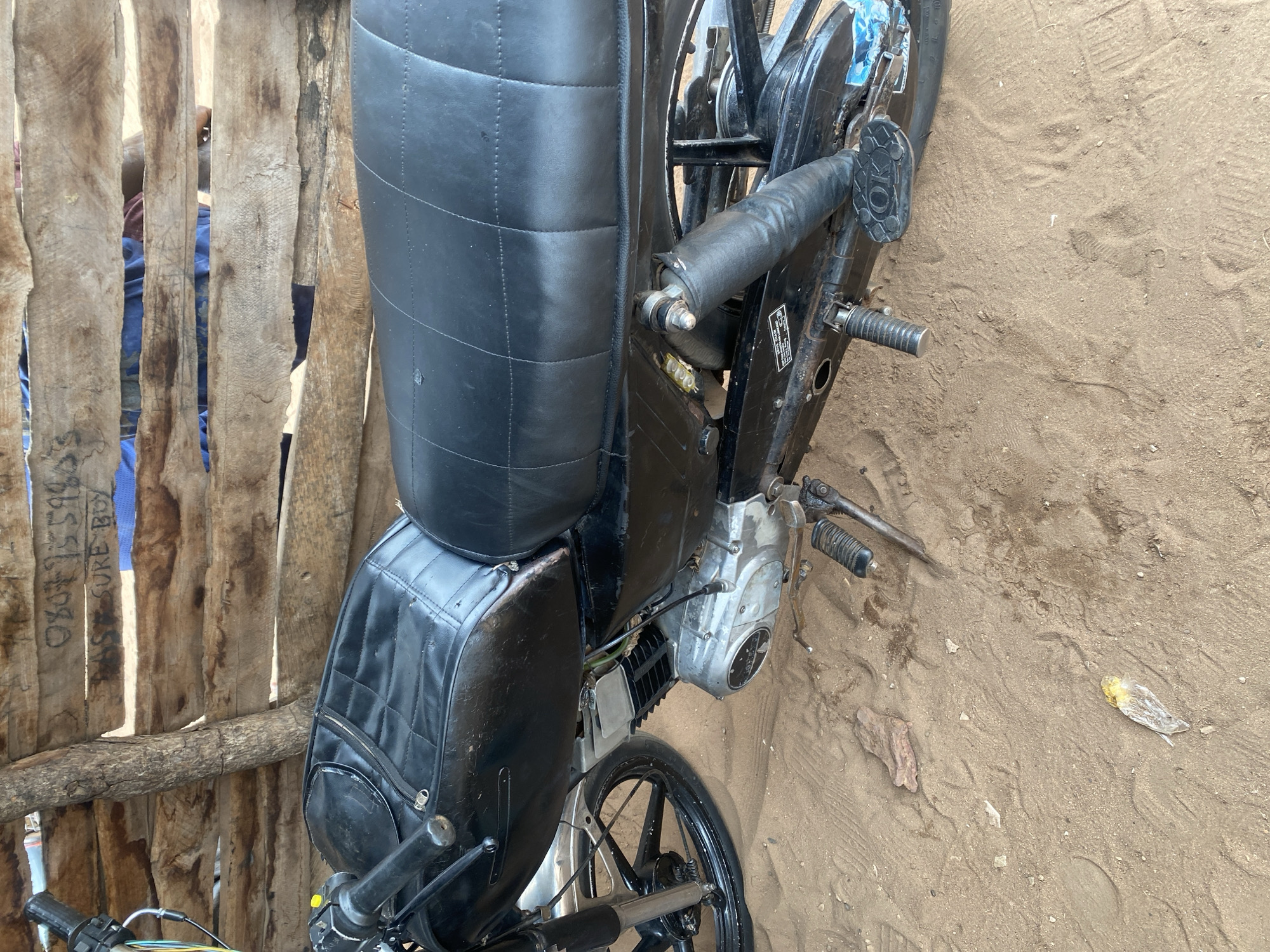 A black motorcycle is parked on sandy ground in Okura, Nigeria. The motorcycle is positioned adjacent to a wooden structure. Part of a person wearing a blue shirt is visible through the wooden structure. A piece of plastic is lying on the sand.