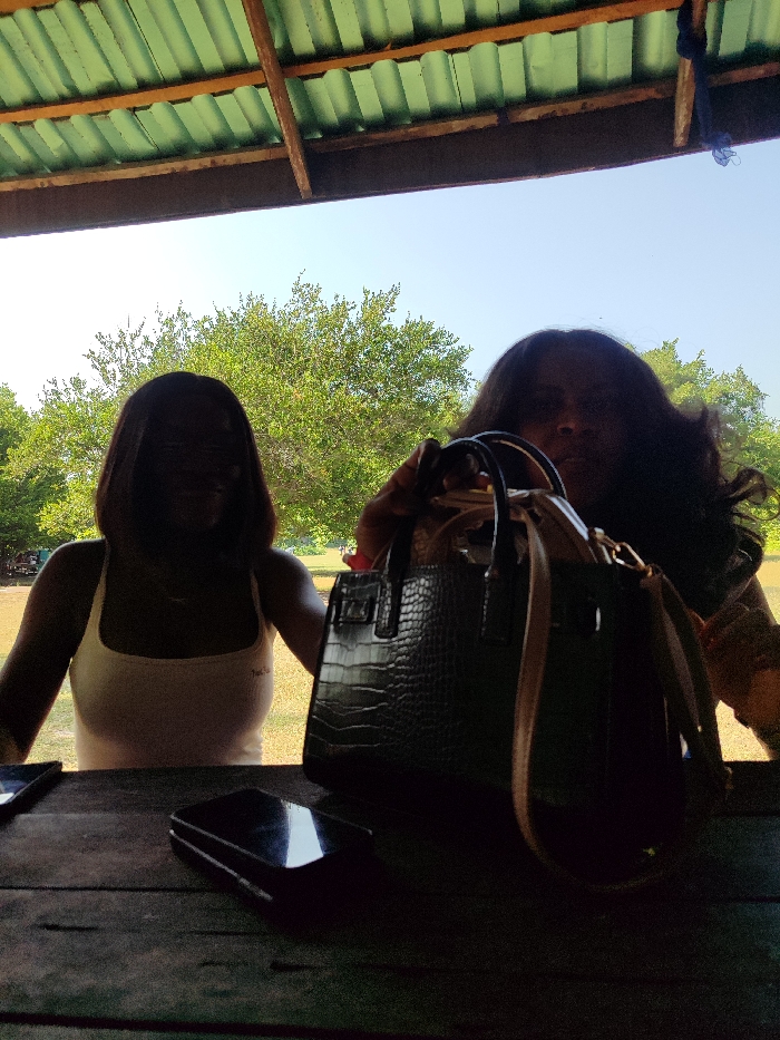 An outdoor scene in Lekki, Nigeria, captured during daylight hours, depicts two individuals seated at a rustic wooden plank table beneath a shelter with a green corrugated metal roof and exposed wooden beams. Both subjects are heavily silhouetted due to backlighting from a bright sky and lush green foliage in the background. The person on the left wears a light-colored tank top. The individual on the right holds up a dark, crocodile-textured handbag with a beige shoulder strap. Two black smartphones, one partially visible and one flipped closed, rest on the table surface in the foreground.