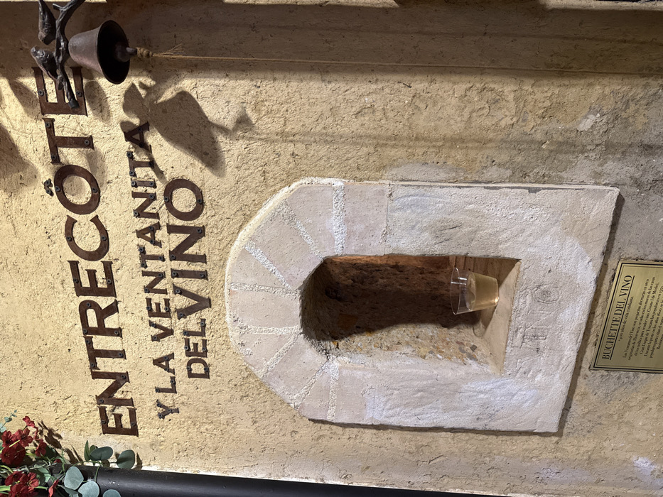 This image depicts a section of a textured, light-brown stucco wall, likely part of an establishment in El Retiro, Colombia. Mounted prominently on the wall are dark, riveted metal letters spelling "ENTRECOTE" and directly below it, "Y LA VENTANITA DEL VINO." Centered beneath the text is a small, arched niche framed with light-colored stones, which reveals a darker, earthy interior. Within this niche, a clear plastic cup containing a light-yellow liquid and a few ice cubes rests on a horizontal ledge. To the upper right, a dark metal bell hangs from a decorative branch-like fixture that features two small bird figurines; a rope extends downward from the bell. Prominent shadows, including a large bird-shaped shadow cast by the bell fixture, are visible on the wall to the right. In the upper left corner, artificial red flowers and green foliage are partially visible next to a dark vertical pipe. Below the niche, a small, rectangular plaque titled "BUCHETTE DEL VINO" displays text in Spanish. No people, specific actions, or direct interactions are visible in the scene.