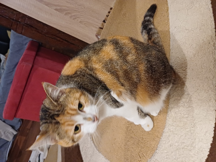 - "An interior scene in Dolna Oryahovitsa, Bulgaria, features a domestic short-haired cat exhibiting calico and tabby markings, with a coat primarily white, orange-brown, and dark brown/black" by FM-BPoag1, licensed under CC BY 4.0
