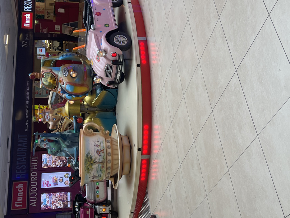 The image displays an unoccupied children's amusement ride carousel located inside a commercial building, specifically in front of a Flunch restaurant