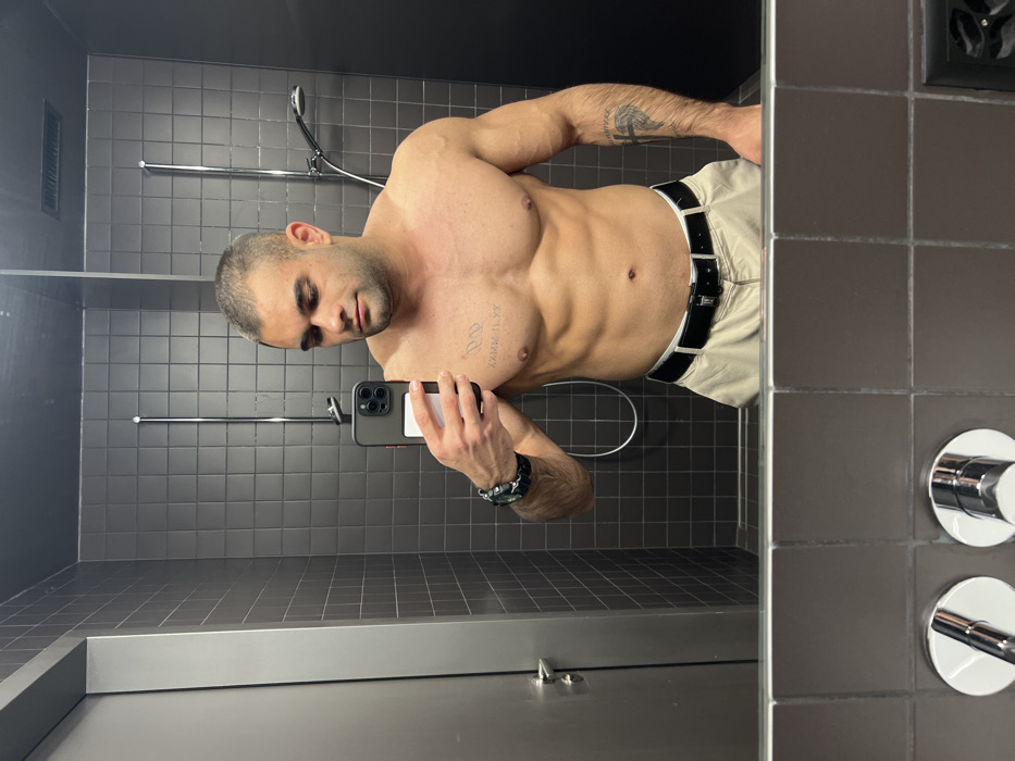 - "This image captures a mirror selfie of a muscular adult male within a modern, dark-tiled changing room or private bathroom, located in Basel, Switzerland" by FM-4IK9y2, licensed under CC BY 4.0