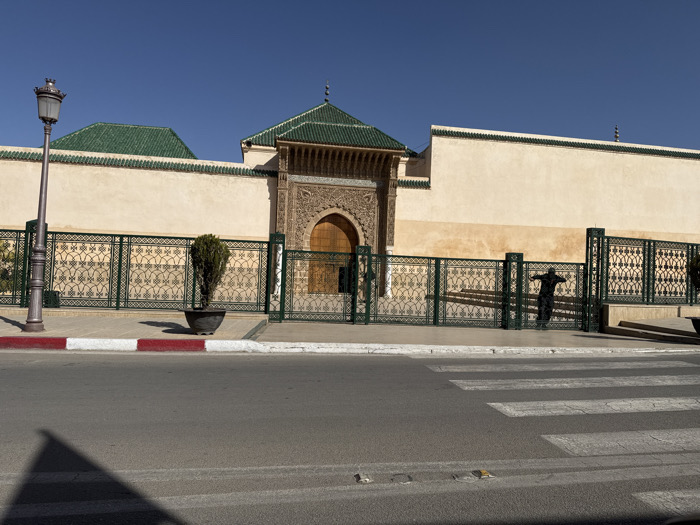 The image depicts a street scene in Al Machouar – Stinia, Morocco, featuring a large, ornate building under a clear blue sky. The building, likely a mausoleum or significant historical structure, is characterized by its light-colored, possibly beige or tan, exterior walls and multiple sections topped with distinct green tiled roofs. A prominent central entrance features intricate, dark carved ornamentation surrounding a wooden door. In front of the building, a dark green metal fence with a repeating geometric pattern runs parallel to the street, separating the sidewalk from the building's facade. Along this fence, on the left, an old-fashioned street lamp post with a dark finish is visible. Further right along the fence, a solitary, conical potted plant sits on the sidewalk. A pedestrian, dressed in dark clothing, is positioned approximately in the middle-right of the fence line, with arms outstretched horizontally, appearing to be interacting with or leaning against the dark green metal fence. The individual's body is mostly obscured by shadows and the fence structure itself. The foreground consists of an asphalt road with a marked pedestrian crossing featuring two thick white stripes. The edge of the sidewalk is defined by a curb painted with a red band over a white band. Strong sunlight casts distinct shadows across the road and sidewalk, indicating a bright day.