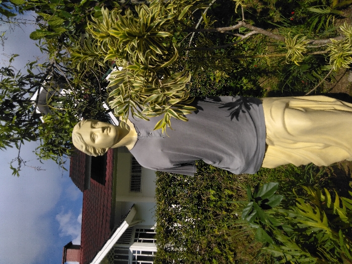 This image captures an outdoor garden scene in Tilburg, Netherlands, under daylight with partial cloud cover. A life-sized classical-style female statue occupies the central foreground. The statue, constructed from a light yellowish-cream material, displays an intact head and neck with a serene expression and wavy hair. Its armless torso is clad in a grey, short-sleeved Henley shirt with a three-button placket. The lower body retains classical drapery. In the left background, a white residential house with a dark red tiled roof and white-framed gabled windows is partially visible, fronted by a dark green hedge. The right background features dense green foliage, including a prominent plant with variegated green and yellow leaves that partially obscures the statue's right side. Sunlight illuminates the scene, casting a shadow from foliage onto the statue's shirt. No people are present.