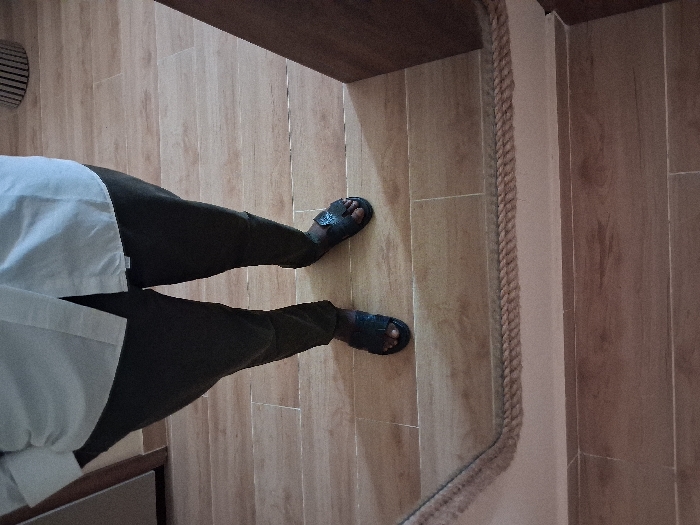 The image, captured in the city of Takum, Nigeria, displays a person from the waist down, reflected in a mirror. The individual wears a white long-sleeved shirt and dark-colored trousers, with hands in the pockets. On their feet are black open-toed sandals. They stand on a light-toned ceramic tiled floor, which features a wood-grain pattern laid in a staggered bond. The lower edge of the mirror is visible in the foreground, framed by a braided rope-like border. Reflected in the background are a partial wooden door frame to the left and a vertically striped object, consistent with a basket or stool, to the right.
