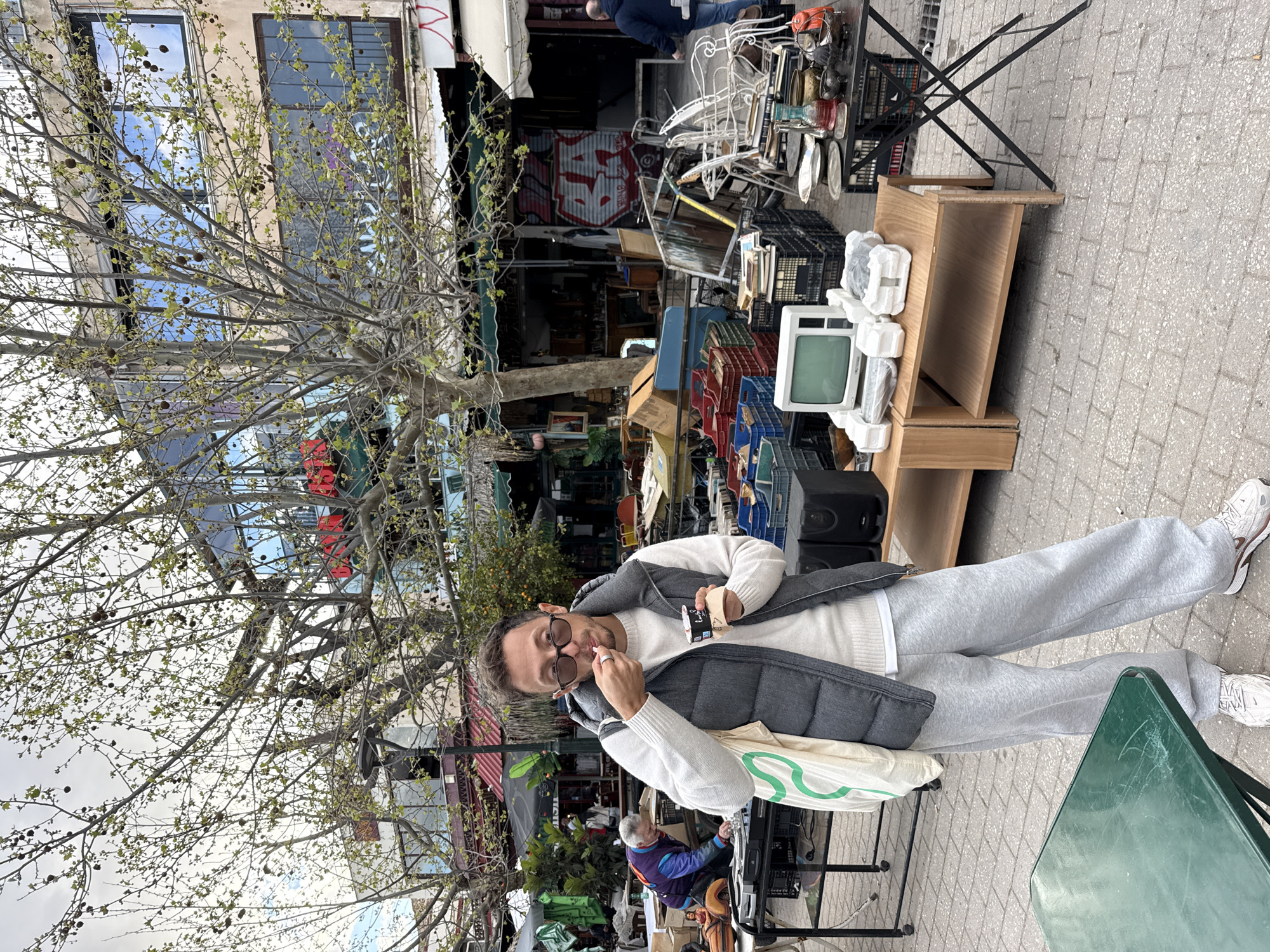 The image depicts a man standing in front of an outdoor market scene in what appears to be Athens, Greece. The man is wearing a white sweater, grey sweatpants, a grey vest, and white sneakers. He is holding a small container and a spoon to his mouth, suggesting he is eating. He has dark hair and is wearing sunglasses. Behind him is a cluttered market scene. There are various items for sale, including furniture, electronics (a CRT television), books, and miscellaneous household goods. The items are arranged on tables and on the ground. In the background are buildings with trees in front of them. The trees are bare, suggesting it is either late autumn or early spring. The sky is overcast. There are other people in the background, mostly obscured by the market stalls. The setting is likely a flea market, popular in Athens. The location would be near Monastiraki Square, due to the nature of the market scene.
