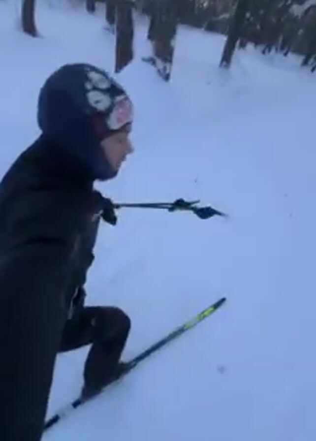 A man wearing a dark jacket and a winter hat is cross-country skiing in a snowy forest. He is filming himself while skiing, occasionally speaking. The ground is covered in deep snow, and trees are visible in the background. It appears to be a bright day, though possibly overcast.