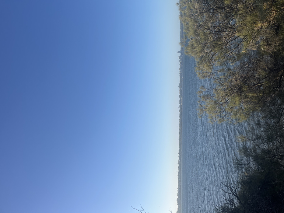 The image depicts a daytime panoramic view from an elevated position in Applecross, Australia, overlooking a wide body of water. The upper half of the frame is dominated by a clear, bright blue sky with a subtle gradient, becoming lighter towards the horizon. There are no clouds visible. Below the sky, a distant landmass stretches horizontally across the mid-ground. On this far shore, a city skyline is discernible, composed of multiple buildings of varying heights. A small, light-colored object, consistent with a boat, is faintly visible on the water near the distant shore, positioned slightly to the left of the image's vertical center. The body of water itself is dark blue-grey, exhibiting numerous small ripples across its surface, suggesting gentle movement. The lower quarter to one-third of the foreground is filled with dense foliage from multiple bushes or trees. This vegetation features intricate branches and small, predominantly green and brown leaves, partially obscuring the immediate view of the water and framing the overall scene. No individuals, animals, or active events are present in the scene.