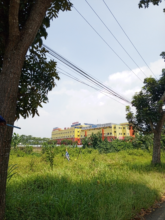 The scene captures an outdoor environment in Multhan, India, under a bright, partly cloudy sky. The foreground is dominated by an expanse of tall, unkempt green grass and sparse shrubs. A large tree trunk with green foliage partially frames the left side of the image, while a smaller tree trunk with leaves borders the right. Several dark power lines are visible, stretching diagonally across the upper portion of the sky. In the midground, within the overgrown field, a blue and white flag-like object is affixed to a thin pole. The background features a multi-story building complex, predominantly yellow with red lower sections. Blue signage is visible on the roof of the main building, displaying text that includes "UNIVERSITAS" and "RSDH". No individuals or specific actions are discernible.