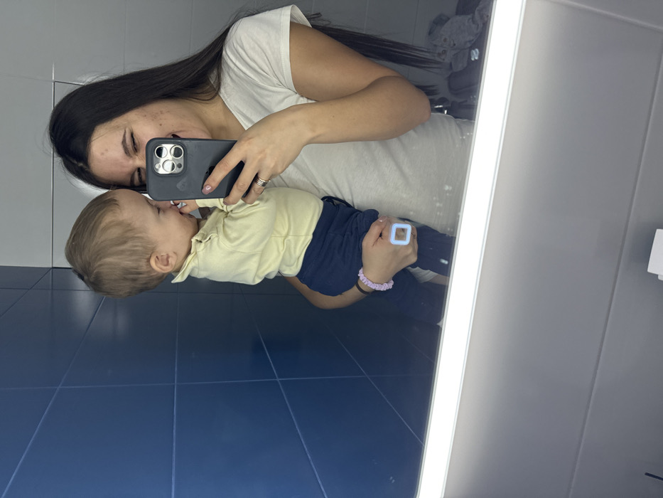 - "The image displays a mirror reflection of an adult female holding an infant, captured in what appears to be a bathroom setting in Akulovo (Gp Kubinka), Russia" by FM-j2hvk2, licensed under CC BY 4.0