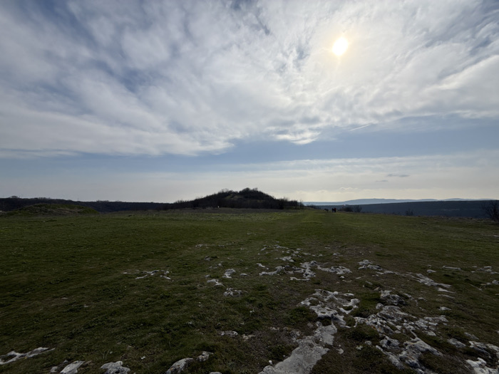 The image displays an expansive outdoor landscape situated in the vicinity of Provadia, Bulgaria. The foreground consists of green grass with numerous irregular patches of light-colored, exposed rock formations. The midground features a large, gently sloping expanse of green pasture. Towards the left midground, a low hill covered with dark, sparse vegetation is visible. In the distant midground, slightly right of center, a cluster of approximately four dark, quadrupedal forms, consistent with large animals such as horses, are discernible on the grassy terrain. The background reveals a series of layered, hazy blue-grey hills and mountains stretching across the horizon. The sky occupies the upper half of the frame, characterized by a mix of white stratocumulus and cirrus clouds. The sun is a prominent, bright, and overexposed disc in the upper right quadrant, with a faint linear contrail visible horizontally in the sky to its left.