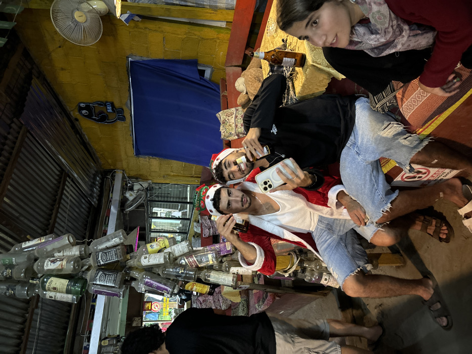 Two men wearing Santa hats and denim shorts pose with beer bottles and a phone, one in a Santa suit. A woman sits to the side. Empty liquor bottles are piled up. The scene is lit by warm-toned lighting. A wall fan is visible along with a blue drape hanging above.