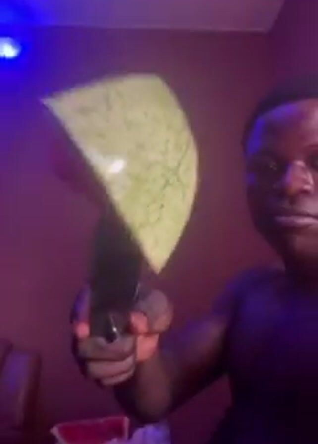 A man is holding a knife with a slice of watermelon impaled on the end