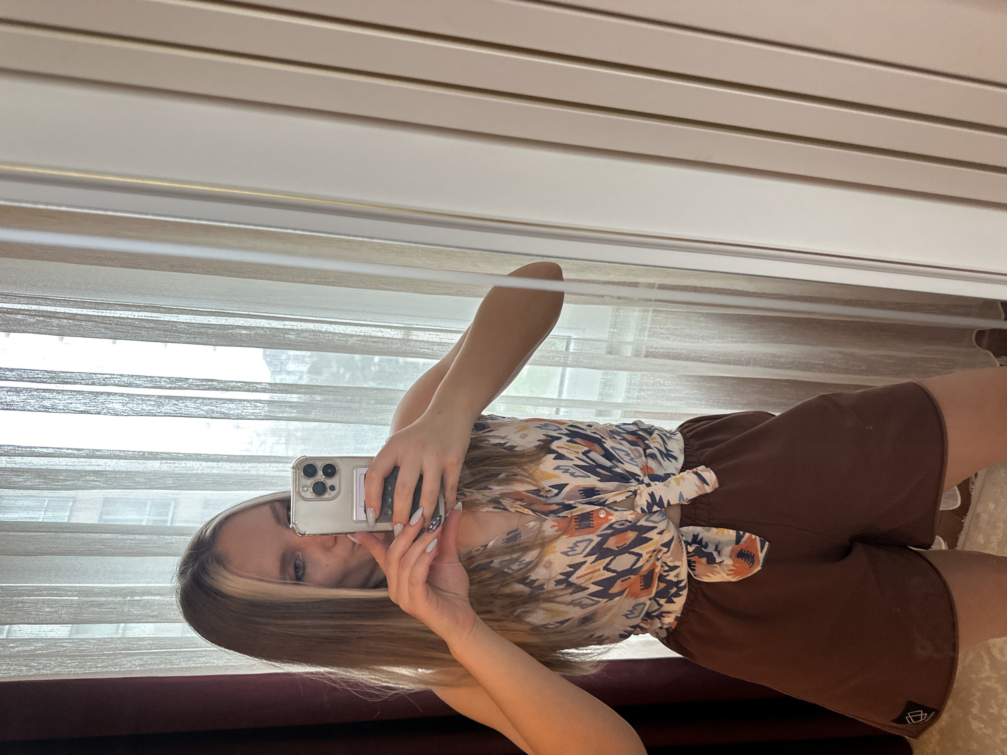 A young woman is taking a selfie in front of a mirror. She is wearing a patterned top tied at the waist and brown shorts. The background features a window with horizontal blinds and a curtain. Based on visual clues, this photo could have been taken indoors, in an apartment in Esenyurt, Turkey. However, there is no definitive evidence to confirm the precise location.