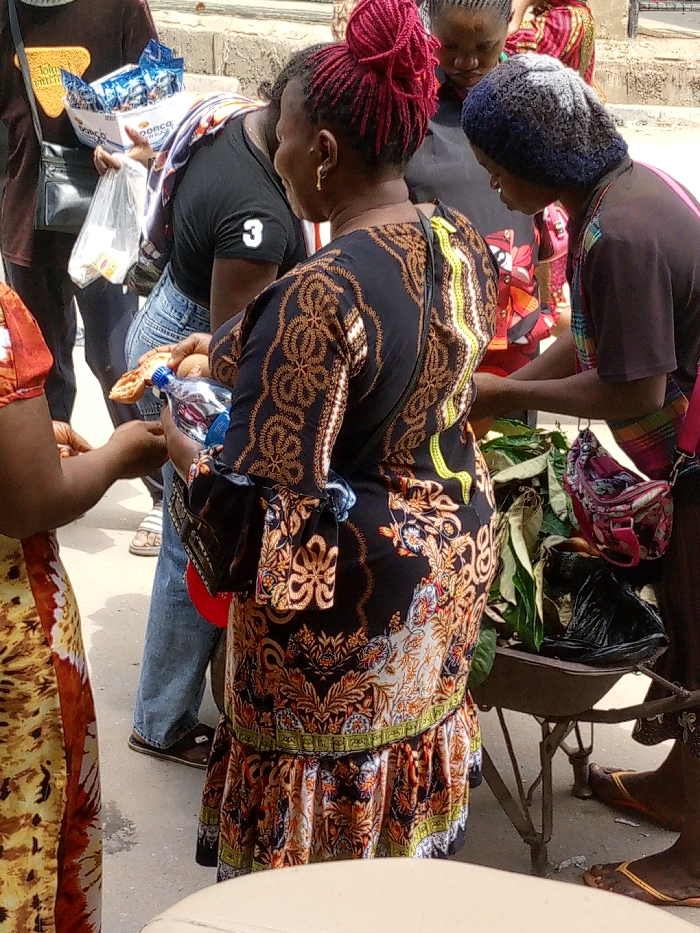 The image portrays a bustling outdoor market scene in Onitsha, Nigeria, under bright daylight conditions. In the center, a woman is seen from behind, wearing a black, long-sleeved dress adorned with intricate brown, gold, and white patterns, featuring a ruffled hem. Her red dreadlocks are styled in an updo. She holds a clear plastic water bottle and a golden-brown pastry in her right hand, while her left hand is extended towards another individual, partially visible on the left, wearing a yellow and orange patterned garment. Behind the central figure, a person in a black t-shirt with a white number "3" on the sleeve and light blue jeans is bending forward, holding multiple white plastic bags containing various packaged goods, some with visible "BONCO" or "DONCO" branding. To the right of the central figure, a woman in a blue and grey knitted cap and a dark top leans over a dark tray filled with green leafy produce, which rests on a metal stand. A pink and purple patterned shoulder bag hangs near her waist. The ground is paved and appears worn. Additional indistinct figures are visible in the background, indicating a crowded public space.