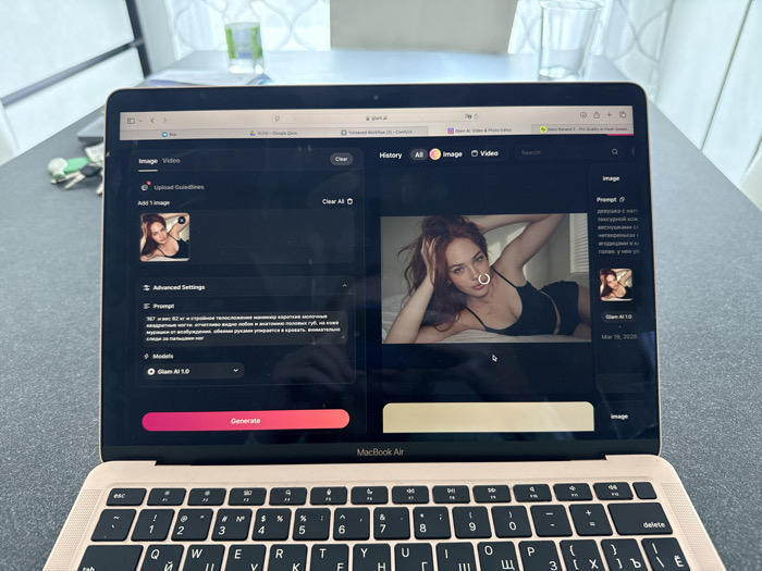 A rose gold MacBook Air laptop, featuring a keyboard with both Latin and Cyrillic characters, is positioned on a dark grey tabletop. The screen displays the "glam.ai" web application interface within a browser, with multiple tabs open including "GLOO - Google Docs." The Glam AI interface shows an "Image" generation panel. On the left, an input area includes an uploaded thumbnail image of a woman, "Advanced Settings," and a "Prompt" text box containing Russian text that details physical characteristics and actions related to a slender woman. Below this, "Glam AI 1.0" is selected as the model, next to a prominent pink "Generate" button. The main display area on the right presents a large, partially loaded AI-generated image of a woman with auburn hair, wearing a black bralette and shorts, reclining on a bed. A white loading spinner is visible over her chest. Below this, another Russian prompt and a smaller thumbnail of the same woman are displayed, along with the date "Mar 19, 2026." In the background, to the left of the laptop, a set of keys with a keyring is visible. To the right, on a slightly elevated, lighter surface, a clear glass containing liquid and a plastic water bottle are present. The scene is located in the city of Fano, Italy.