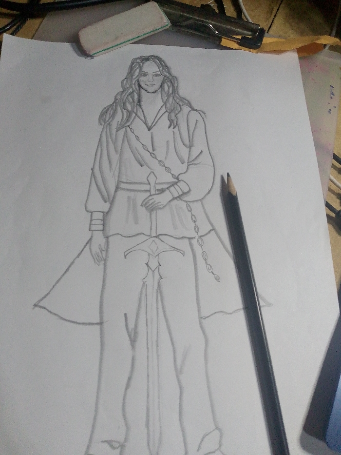 A pencil drawing portrays a woman with long, wavy hair, attired in a loose-fitting garment with billowy sleeves. She holds a sword, its blade extending down the center of her body. A chain drapes across her chest. A cape-like garment is drawn on the back of the figure. A pencil and eraser rest nearby.