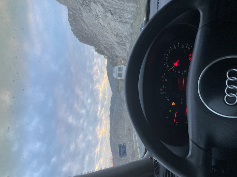 - "The image presents a first-person view from the driver's seat of an Audi vehicle on a road near Velikdenche, Bulgaria, during either dusk or dawn" by FM-EytX72, licensed under CC BY 4.0