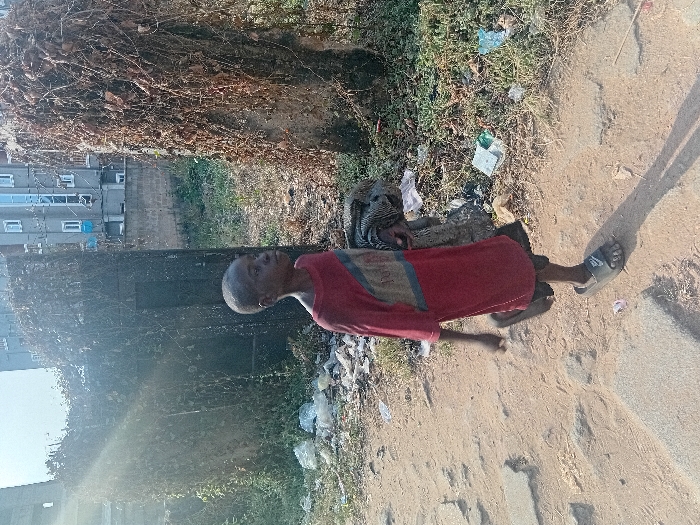 A person wearing a red shirt and sandals lies prone on the ground, seemingly resting or unconscious. The person is surrounded by vegetation and trash along a sidewalk, suggesting a neglected environment. A building is visible in the background. The lighting suggests it is daytime. The photograph’s orientation is vertical, with the subject positioned horizontally in the frame.