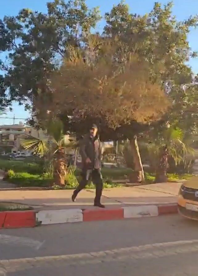 street in what appears to be a sunny, tropical location. The opening shot features a yellow taxi parked next to a curb, with a man walking nearby. The camera then pans to show palm trees and other vegetation. A black car drives past, reflecting the palm trees in its windows. The video ends with a shot of a silver hatchback driving past a wall, with a tower visible in the background.