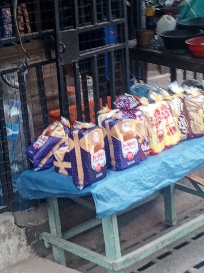 This image documents a street-side bread stall in Onitsha, Nigeria