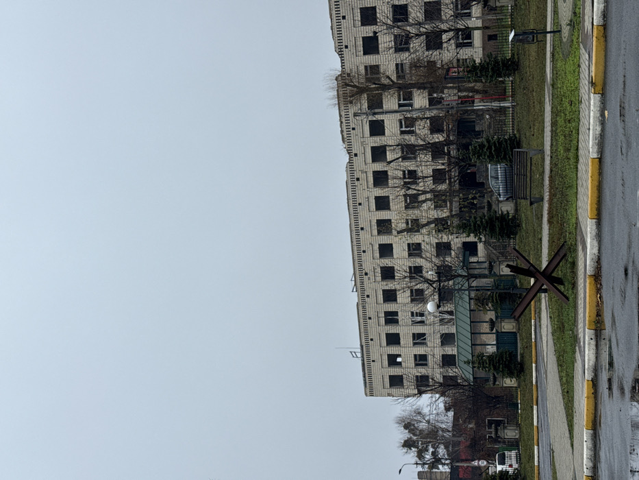 The image displays a six-story, light-colored building in Irpin, Ukraine, exhibiting extensive structural damage under an overcast sky