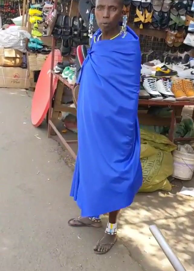 Here's a concise description of the video: The video shows an outdoor street market scene in what appears to be an African country. Several vendors are set up along the sidewalk, displaying goods for sale. One vendor, a woman in a bright blue wrap, stands near a display of shoes and sandals. Another vendor's display is backed by a red AzamTV satellite dish. People are walking by, seemingly browsing or shopping. The environment appears to be bustling with activity and commerce.