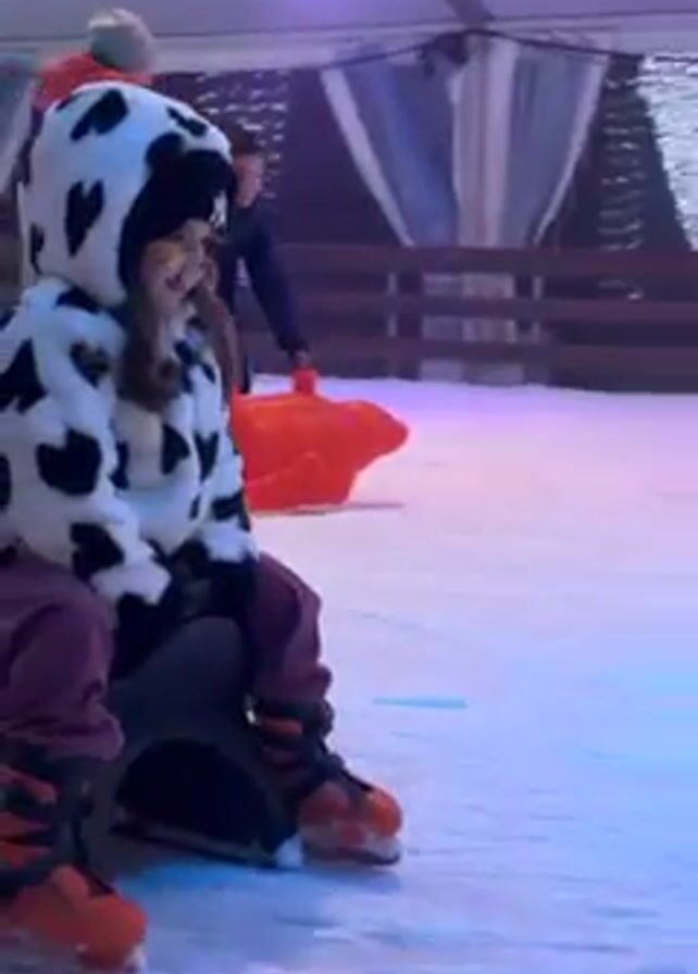A short video shows a young girl ice skating on an indoor rink. She wears a hooded jacket with a black-and-white cow print, purple pants, and orange skates. At the beginning, she is sitting on a black seat with skate blades, but then she is placed on a white-and-black penguin-shaped skate aid. Someone is pushing the skate aid along the ice. Another child in a red-and-green jacket and a boy in a blue jacket can be seen in the background near a red reindeer-shaped skate aid. The ice rink is decorated with string lights, and the lighting in the rink changes from green to blue to purple.