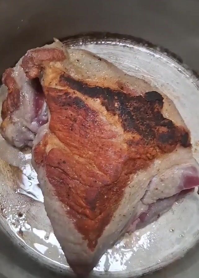 - "A piece of meat, browned, is shown in a large silver pot" by FM-kzA8r2, licensed under CC BY 4.0
