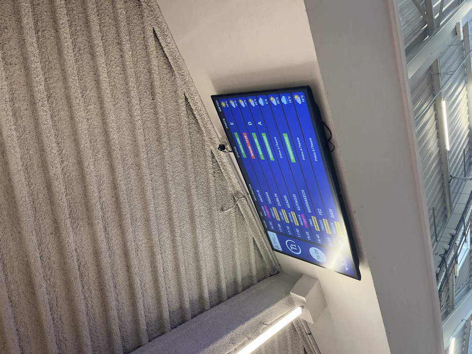 departure board in an airport terminal, located in the city of Tillé, France. The board displays information about various flight departures, including the flight number, time, and destination. The board is a flat, rectangular screen with black text on a blue background. The board is mounted on a white wall, with a corrugated ceiling above it. The departures listed include Tirana, Dublin, Agadir, Kutaisi, Marrakech, Fez, and Bari. The board also indicates the status of each flight, with information about gate, and weather conditions for each destination. The temperature is displayed in Celsius for each destination. The weather conditions are also shown with icons: sunny, cloudy, partly cloudy, and partly cloudy with rain. The board is tilted slightly upwards, and the environment is an airport terminal, with white walls and lighting.