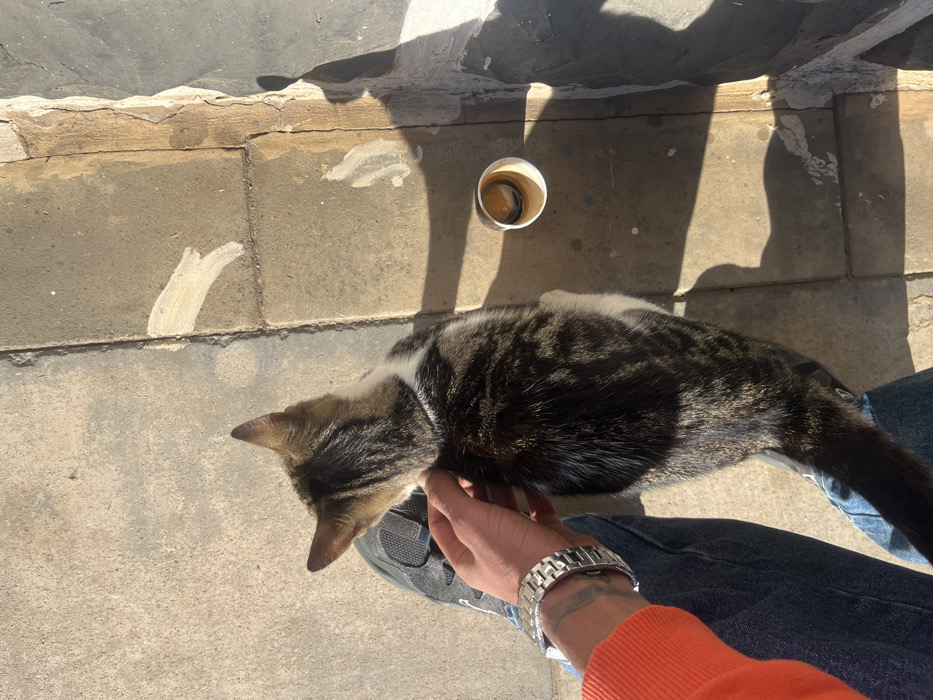 This image depicts an outdoor scene in the city of Meknes, Morocco, captured from an overhead perspective. A person, partially visible, is wearing blue denim jeans, a dark athletic shoe on the left foot, and an orange long-sleeved garment on the left arm. A silver-toned wristwatch with a link bracelet is worn on the left wrist. The person's left hand is engaged in petting a domestic short-haired cat. The cat is positioned on the ground in front of the person's left leg, facing away from the camera, displaying a tabby pattern of dark brown and black stripes with white markings on its underside. To the cat's right, a white disposable cup containing dark liquid residue rests on the paved ground. The ground consists of rectangular concrete or stone slabs, exhibiting wear, cracks, and light-colored streaks or residue. Strong, direct sunlight illuminates the scene, casting distinct, elongated shadows.