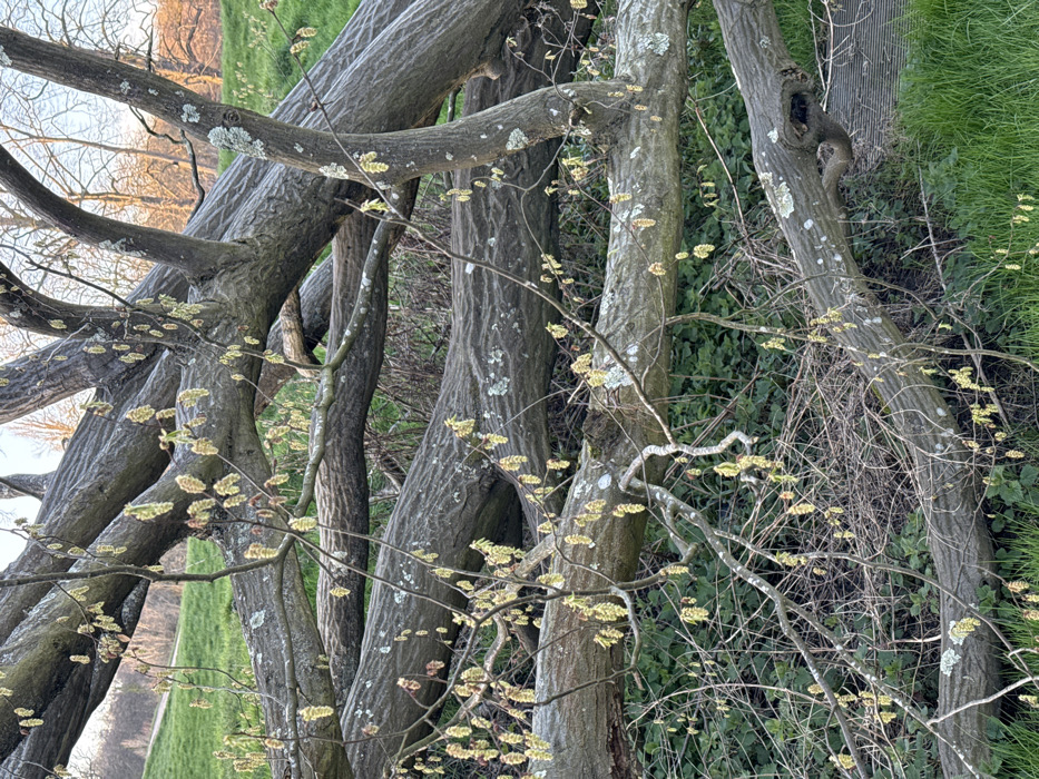 This image depicts a natural outdoor scene within a park or natural area in the City of London, United Kingdom. The foreground and midground are dominated by a dense, crisscrossing arrangement of multiple fallen tree trunks and thick branches. These prominent wooden elements exhibit grey-brown bark with visible texture and sporadic patches of light grey-green lichen. Numerous thinner branches extend from the larger logs, densely adorned with clusters of elongated, pale yellow-green catkins or early spring buds. The ground beneath and between the logs is covered by a mix of dark green, low-lying vegetation and dry brown twigs. Bright green grass forms the ground cover in the immediate foreground and on a gentle incline that rises in the midground and background. A narrow, light-colored path is faintly visible on the distant grassy slope in the upper left. A line of bare deciduous trees stands against a pale, diffuse sky in the far background. No human figures are present in the scene.