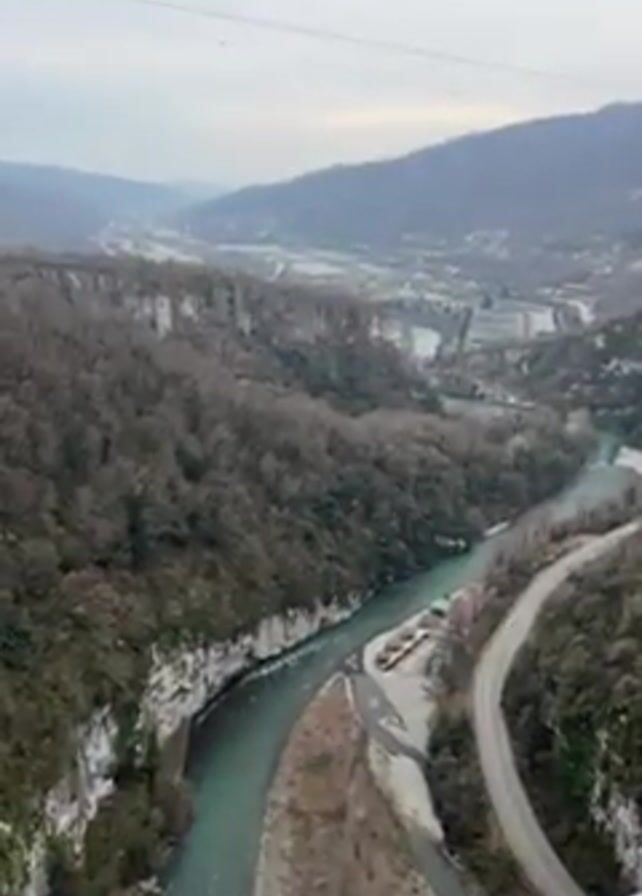view from a high bridge over a river valley. The river winds through the valley, and a road follows its course along one side. The valley is surrounded by tree-covered hills, with some rocky cliffs visible. In the distance, there is a flatter area with some buildings. The bridge itself has a metal frame and a walkway. The sky is overcast. There are no people visible in the video.