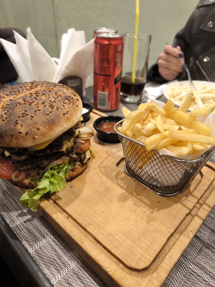 The image displays a meal served on a light brown wooden board in an indoor dining establishment located in Mechouar Kasbah, Morocco. A large burger, featuring a sesame seed bun, two meat patties, melted cheese, lettuce, sliced tomatoes, and grilled onions, rests on the left side of the board. To its right, a metal wire basket holds a portion of golden french fries. Two small black ramekins, one containing a white sauce and the other a red sauce, are positioned behind the burger. The wooden board sits on a patterned placemat. In the background, a clear glass filled with a dark beverage and a yellow straw is visible next to two red aluminum cans, one identifiable as Red Bull. On the far right, a person's hand, adorned with dark nail polish and wearing a black jacket, holds a fork, reaching towards additional french fries on a white plate. A dispenser or stack of white napkins is present behind the main burger. The background shows blurred, light-colored walls, indicative of a restaurant or cafe environment.