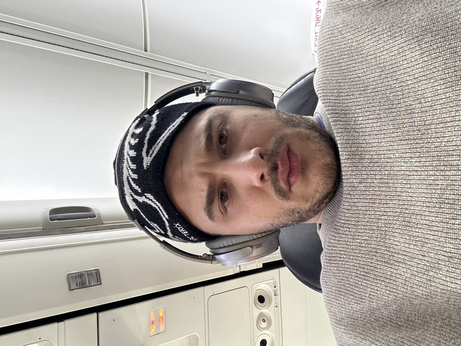 A male subject, appearing to be in his late 20s to early 30s, is depicted in a close-up, chest-level shot. He has short dark hair partially covered by a black knit beanie with a white patterned design, possibly an Arc'teryx logo visible on the left side. He wears light grey over-ear headphones. His facial hair includes a mustache and short beard stubble. He is wearing a light grey, ribbed knit sweater. The subject maintains a direct gaze towards the camera. The environment is the interior of a commercial airplane cabin. Visible elements include a dark-colored airplane seat headrest behind the subject, and white or light grey overhead cabin panels. On the left side of the frame, an overhead passenger service unit is visible, showing partially illuminated orange 'no smoking' and 'fasten seatbelt' indicator lights, along with individual air vents and reading lights. On the upper right side of the frame, a segment of the cabin ceiling and an overhead compartment latch are visible. A red and white 'יציאה EXIT' sign (Hebrew for Exit) is partially visible on the right side of the cabin wall, below the window line. The image provides no visual cues to confirm a specific geographical location within the city of Ferno, Italy.