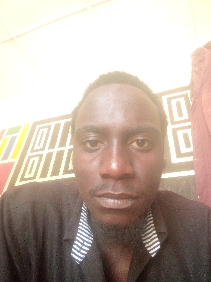 A frontal portrait depicts an adult male with dark skin, short dark hair, a mustache, and a sparse beard, positioned indoors in the city of Duk, Nigeria