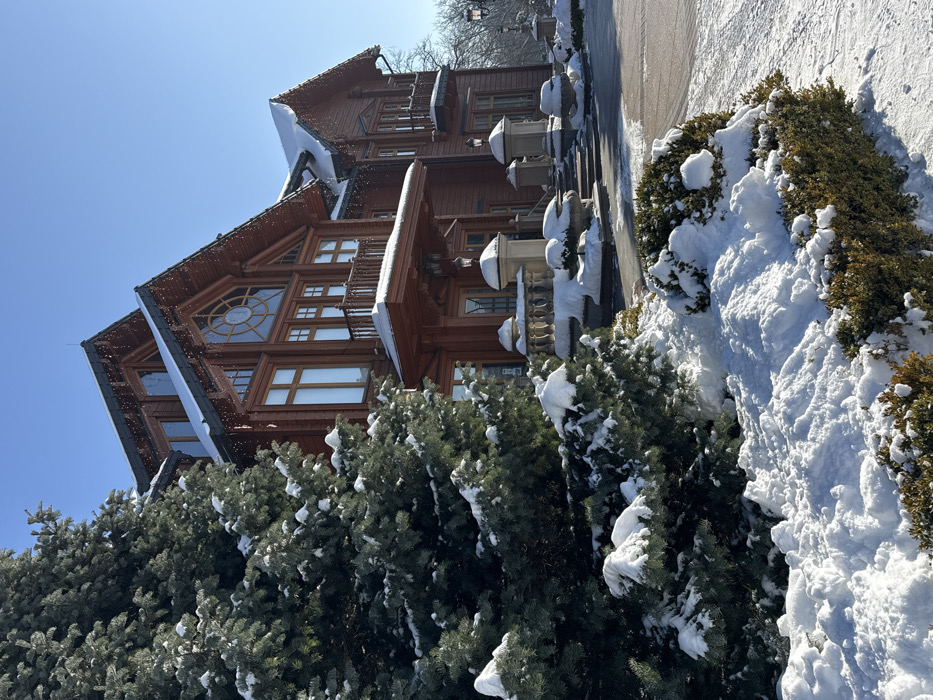 This image depicts the "Honka" dacha, a prominent wooden residence located within the Mezhyhirya Residence complex in Novi Petrivtsi, Ukraine. The scene is set during winter, characterized by a clear blue sky and substantial snow cover across the landscape and building surfaces. The multi-story dacha, constructed primarily of dark stained timber, features multiple gabled roofs heavily laden with snow. Decorative string lights are visible along the eaves, partially covered by snow. The central facade includes a large, ornate circular window on the upper level, flanked by numerous rectangular windows. Wooden balconies with railings are present on multiple levels. A covered entrance portico, supported by columns, leads to a set of stone stairs accessing the main entrance. Two ornate, traditional-style street lamps are visible near the building's approach. In the foreground, a large evergreen tree, possibly a spruce or fir, is heavily covered in snow and dominates the left side of the frame. Snow also covers ground-level bushes, sculpted hedges, and accumulates in various piles. A paved pathway or driveway, partially cleared of snow, runs in front of the residence. Bare deciduous trees are visible in the distant background to the right. No individuals are present in the image.