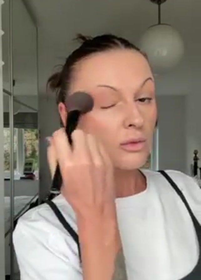 A woman is facing the camera, applying makeup. She has brown hair pulled up in a bun, and a tattoo on her left forearm. She is wearing a white t-shirt over a black tank top. She is applying a dark colored powder to her face with a large makeup brush. She is blending around her forehead and cheeks, and then near her eyes. The background includes a white wardrobe, a window looking out to trees, and a hanging ceiling light.