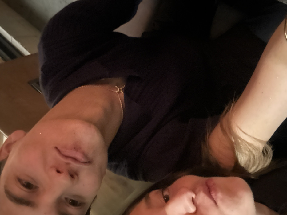 Two people pose closely. A person with short, light-brown hair and fair skin is in the top left corner. A gold chain necklace adorns their neck. The second person has dark hair and fair skin. Both individuals wear dark clothing. Part of a door is visible in the upper left background. The photo's lighting and orientation are slightly off.