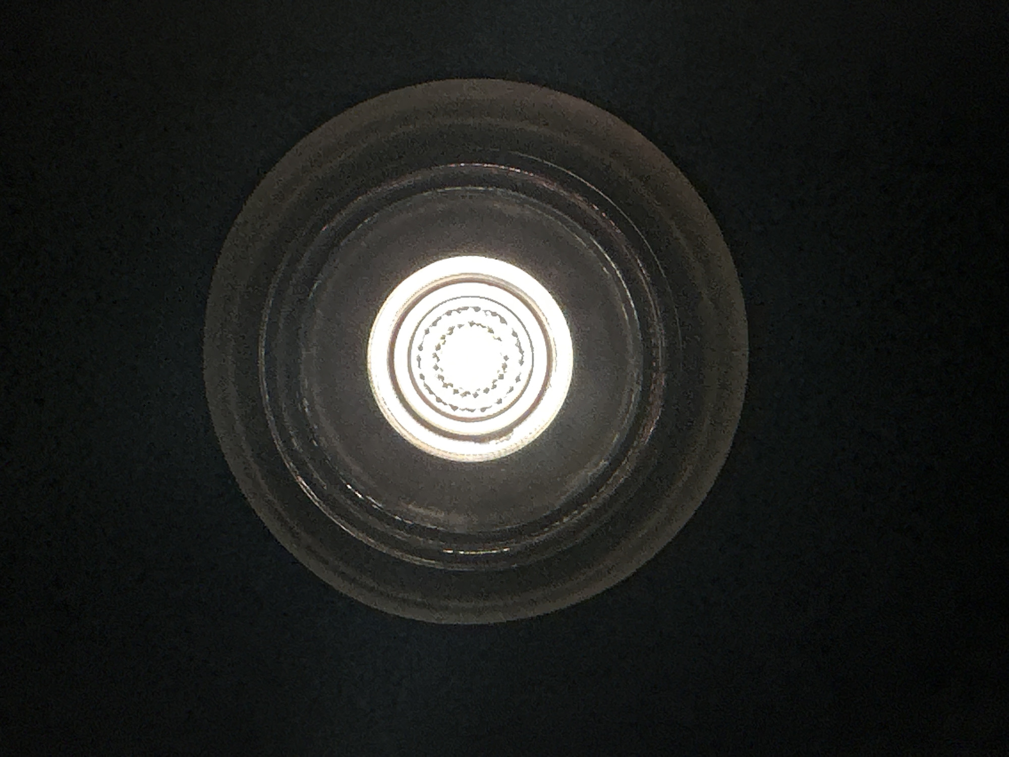 A frontal view depicts an illuminated circular light fixture against a uniformly dark background, located in Lelystad, Netherlands. The central subject is a bright, white light source, appearing as a point of intense light surrounded by concentric rings of diminishing brightness. A pattern of small, distinct luminous dots, characteristic of an LED array, is visible within the light's core. This light is encased within a wider, darker circular housing or bezel, which exhibits slight surface texture and minor reflective qualities. No people, other discernible objects, actions, or interactions are visible within the confined, low-light environment.