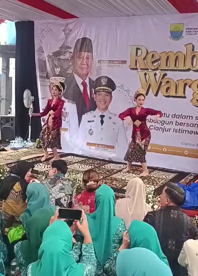 The video captures a performance of traditional Indonesian dance for an audience, likely at a local government event. Two women dressed in red tops and patterned brown skirts are dancing on a small platform decorated with rugs. They wear traditional headdresses, and their movements are coordinated and graceful. Behind them, a large banner displays the words "Rembug Warga Cianjur Istimewa" along with photos of two men, presumably local officials. The backdrop is a combination of white fabric with the event's banner. In the foreground, an audience is seated on the floor, watching the performance. Many of them are wearing green hijabs. Several people are holding up their phones, recording the dance. The setting appears to be an outdoor or semi-outdoor venue under a tent or awning with white and red striped material. A fan is seen in the background, providing ventilation.
