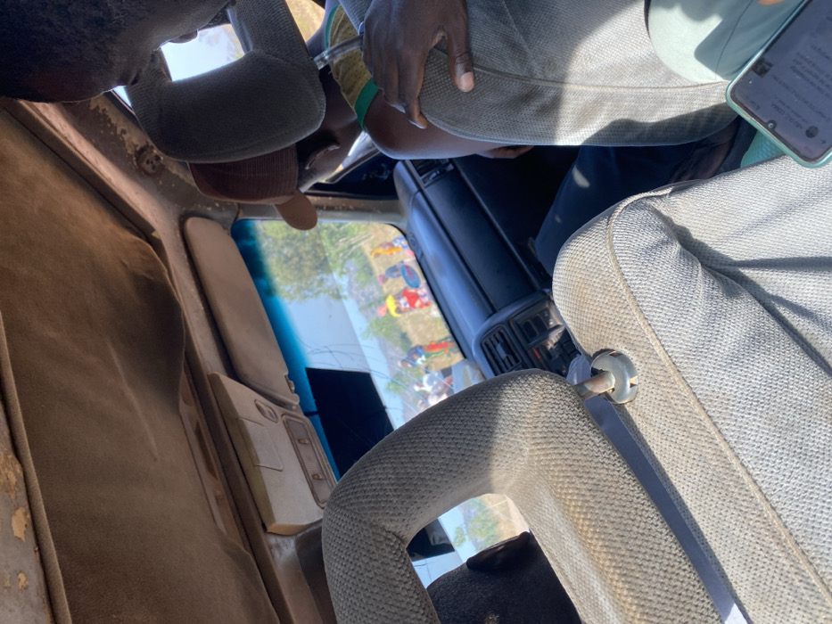 The image depicts a scene captured from within a vehicle in the city of Wang, Nigeria, looking out through a fractured windshield. The interior of the vehicle shows a worn, tan fabric headliner and two grey fabric front seats. The back of the front passenger seat's headrest is visible in the left foreground. To the right, a dark-skinned hand rests on what appears to be a knee or seat, and a smartphone with a green case is held in the lower right corner. A person is seated in the front passenger seat, identifiable by the back of their head, wearing a brown baseball cap and a yellow and green patterned shirt. Beyond the cracked windshield, an outdoor gathering is visible under bright daylight. A group of approximately ten to twelve individuals stands on dry, light-colored ground. They are dressed in various brightly colored garments, including red, yellow, blue, and white. Several individuals appear to be holding dark, round, drum-like objects. The background consists of sparse green vegetation and distant hills under a clear sky, indicating an open, possibly arid or semi-arid environment.