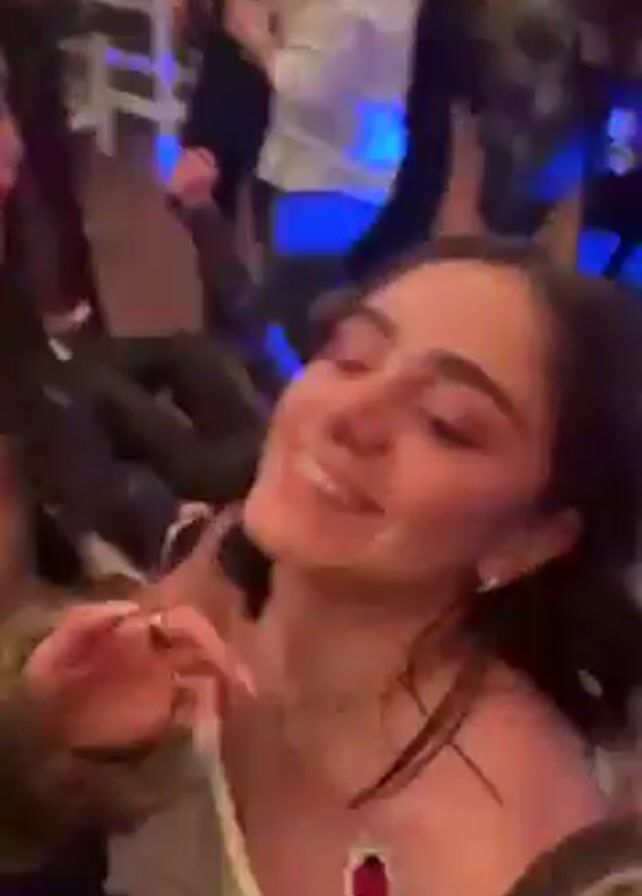 group of young women in a crowded, dimly lit setting, likely a club or party. They are closely gathered together, and one woman is tilting back her head to drink directly from a bottle of clear liquid. The other women appear to be helping her hold the bottle and are cheering her on. The lighting changes colors frequently, from pink to blue to green, adding to the party atmosphere. People are moving in the background, and the general impression is of a lively, social event.