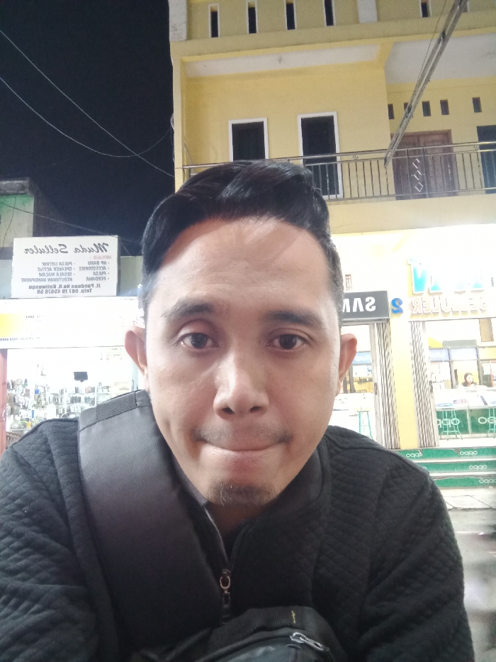 A male individual, likely of Southeast Asian ethnicity, is depicted in a close-up, head-and-torso shot, centered and facing the camera with a neutral expression. He possesses short dark hair styled with a pompadour and a short goatee. He is wearing a dark, quilted zip-up jacket, and a dark bag strap is visible over his left shoulder, with a dark pouch resting in the lower foreground. The scene is illuminated by artificial light at night in Sarimulyo, Indonesia. In the background, a two-story building with a light-yellow facade is visible. The upper floor features narrow vertical windows and a balcony with a metal railing. The ground floor displays brightly lit commercial storefronts. Reversed text on prominent signs includes "Muda Selluler," "SAMSUNG," and "OPPO," indicating mobile phone or electronics retailers. One individual is dimly visible inside one of the stores. Electrical wires traverse the dark night sky in the upper left portion of the image.