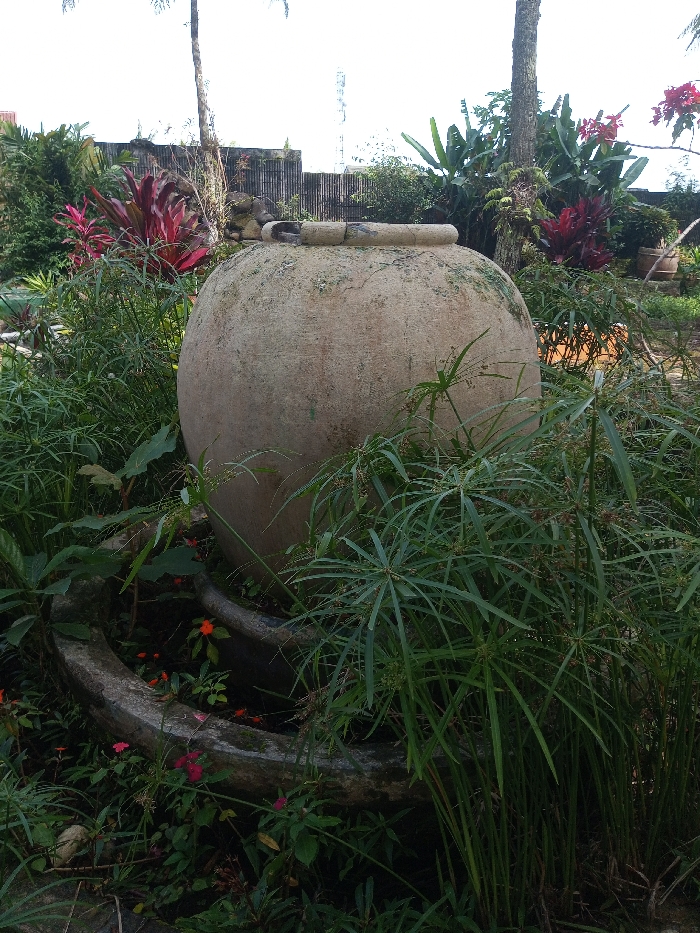 A large, round, earthy-toned pot sits in the center of a lush garden. The pot is partially submerged in a concrete ring, where small flowers bloom. Papyrus-like plants with starburst leaf patterns surround the pot, while other green foliage and red flowers add depth. A variety of plants and trees create a dense backdrop. The scene exudes a tranquil, overgrown garden atmosphere.
