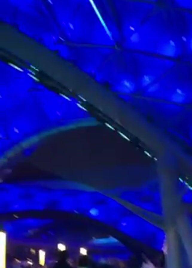 The video presents a view of a futuristic-looking structure. The ceiling is dominated by a vibrant blue color, enhanced by numerous small lights and neon accents, creating a visually captivating effect. The structure is supported by a network of metallic beams, which create a geometric pattern throughout the frame. A dark, elongated object is seen in the upper right corner, obscuring part of the lights. There are also figures moving in the background, but they are out of focus and difficult to discern.